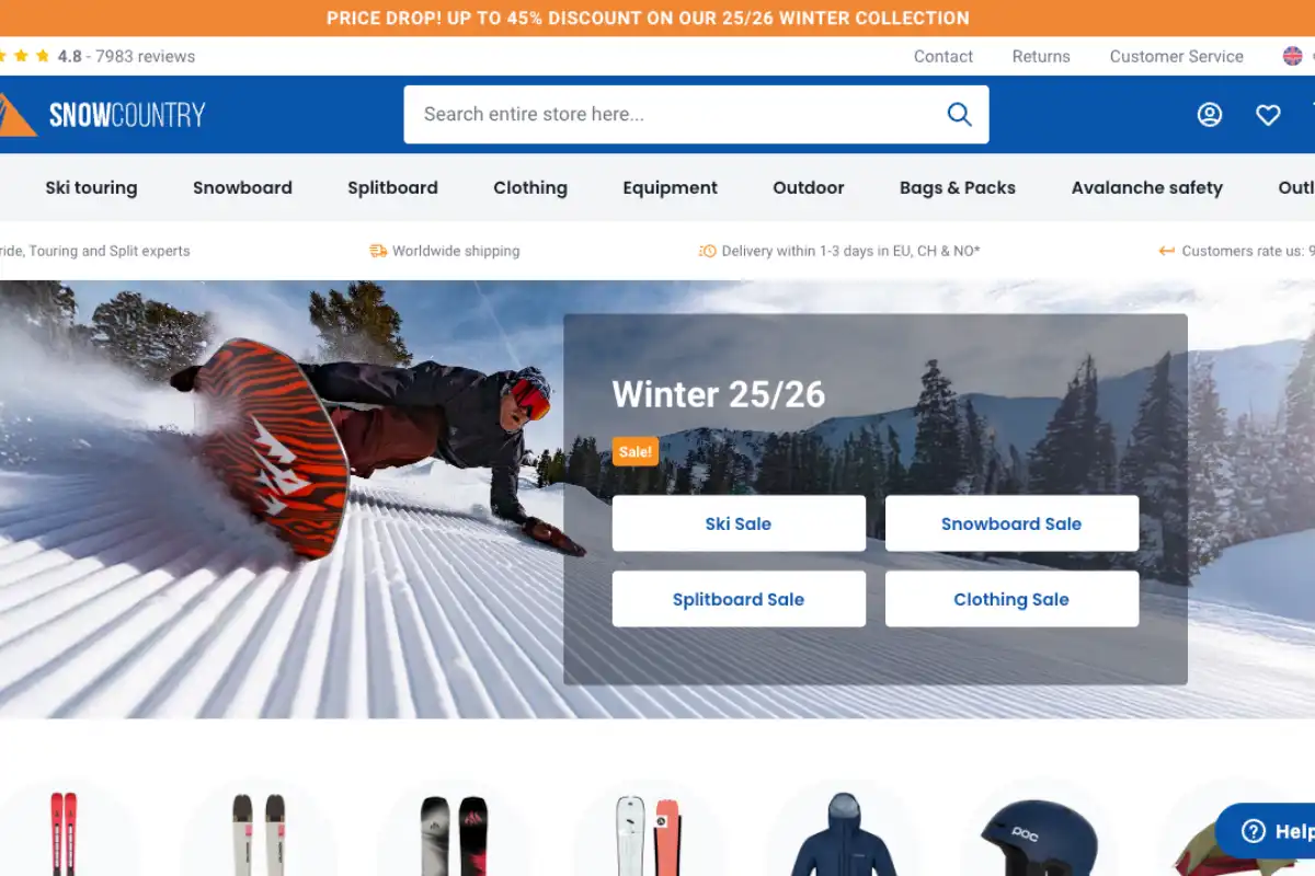 スキー、スノーボード、登山用品に特化したオランダのオンラインショップ。最新のギアが豊富。